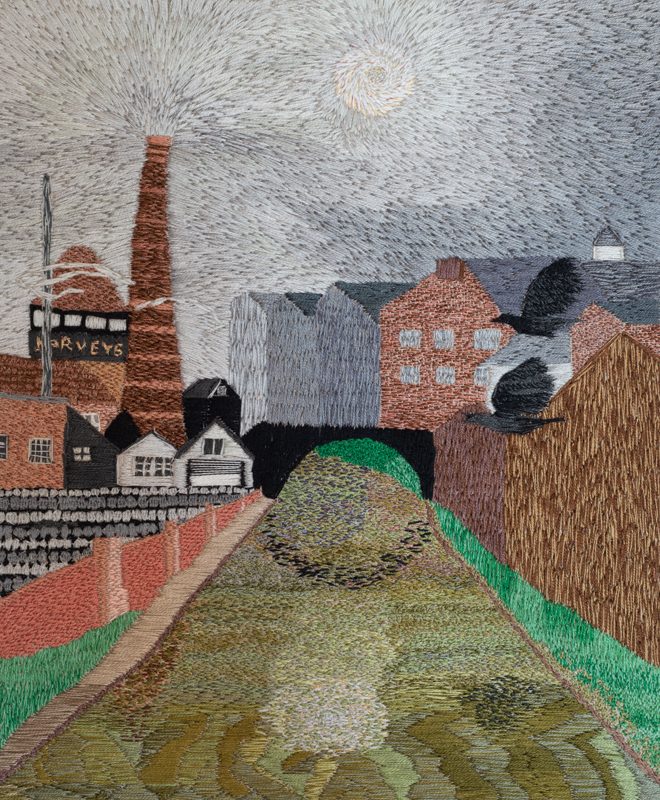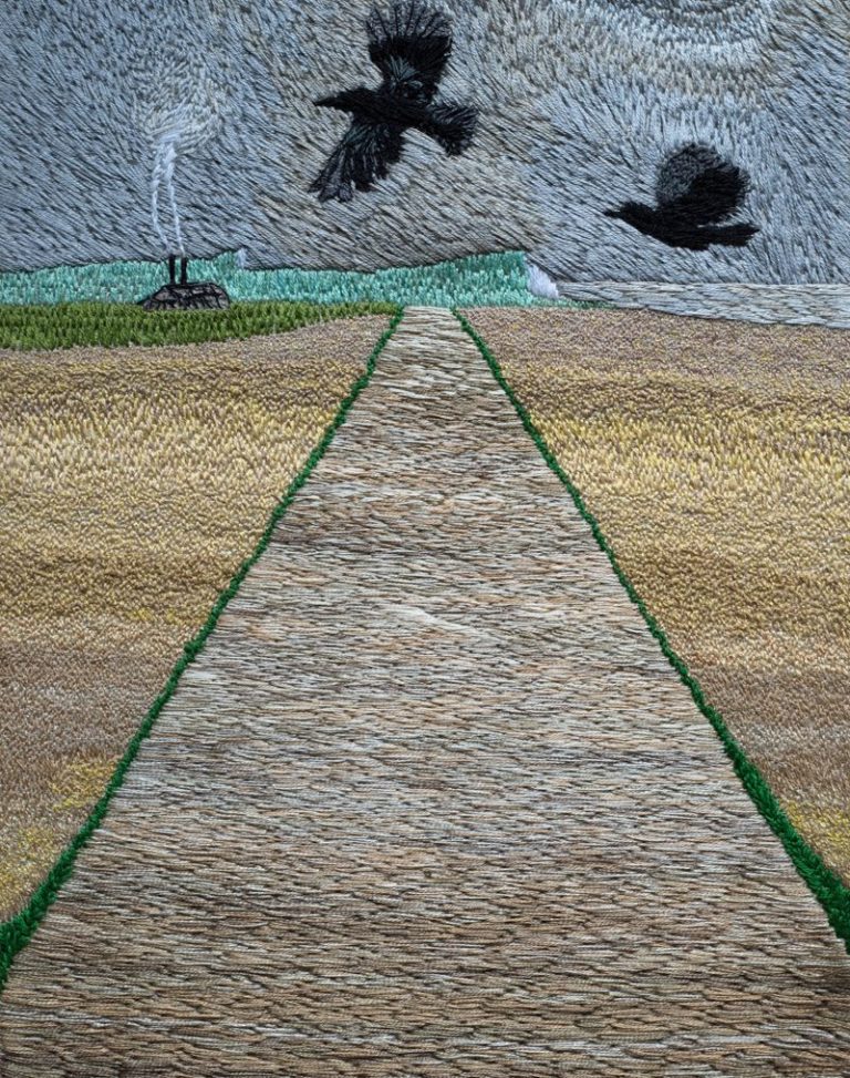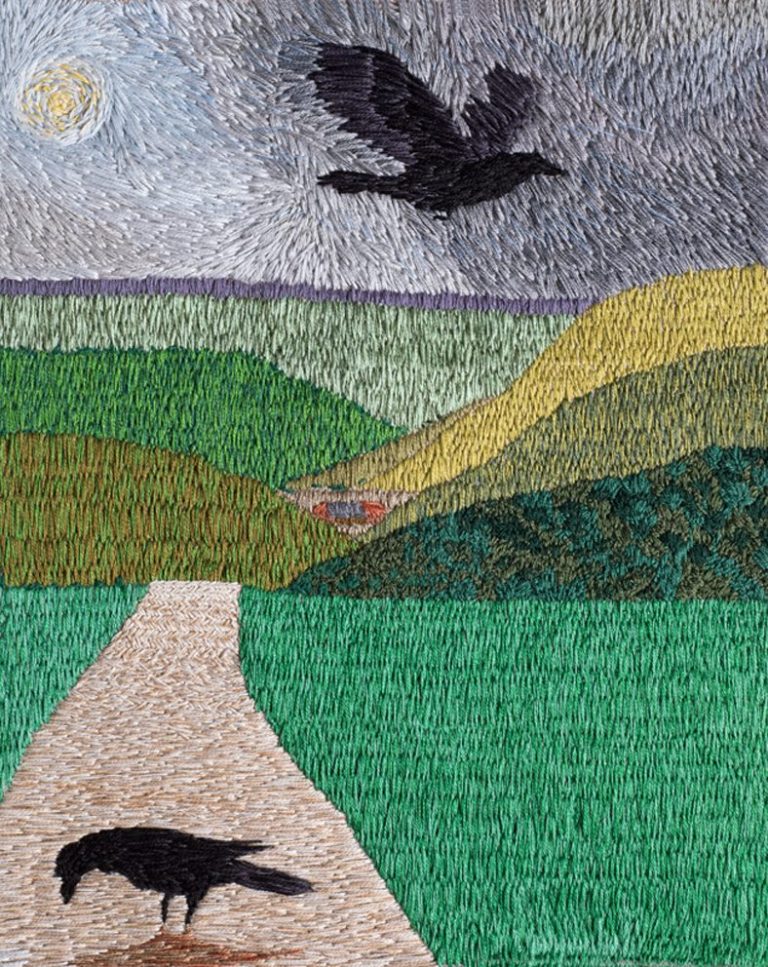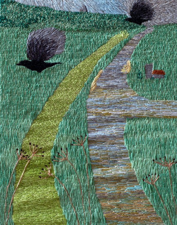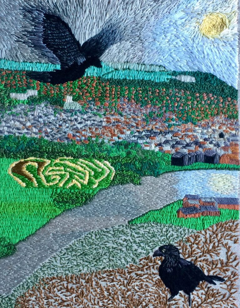 Many of my embroidered landscapes are representations of the views I see when I run. On a long run there are times when you look up through the sweat running in your eyes and think THIS is why I do it. I am a photographer and could use the camera to record these views but there is something about hand sewing them that replicates the plod and effort involved in running. Each stitch a step and each stitch like a brush stroke in a painting or a pencil stroke. Because of the constant movement of running the sewn images don’t represent a view from a single point but more of a sense of the place. An image forms itself in my mind over a period of time and I usually sketch out the idea. I re-visit the place and may take some reference photographs or make sketches. I might make a composite photo to test the image. I often make a few crow sketches from previous photographs as I always include them. When I’m happy with the composition I draw it out on fabric using a watercolour pencil then attach the fabric to a frame. I’ve found over time that it’s pointless to plan things out too much too far in advance because I change my mind and ignore the plan. So although I have a plan of the composition I don’t now plan the colours in advance. I mark the image out but it tends to rub out as I’m working, I don’t always re-draw it in.